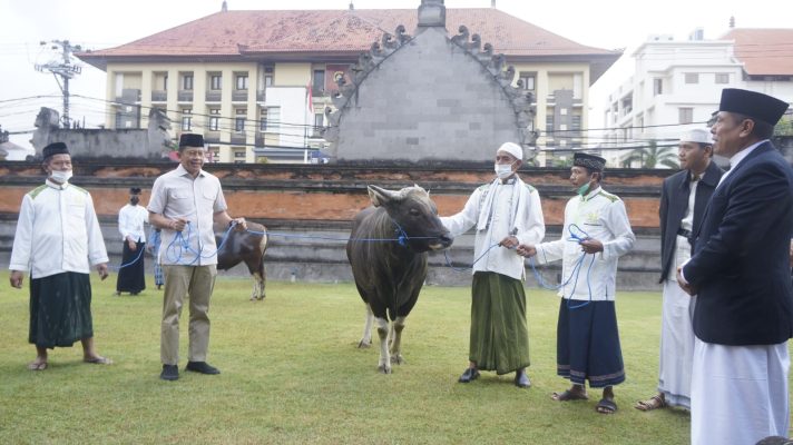 Denpasar – Kapolda Bali Irjen. Pol. Drs. Putu Jayan Danu Putra, S.H., M.Si., bersama Waka Polda Brigjen Pol Drs. Ketut Suardana M.Si., didampingi Irwasda dan Seluruh PJU Polda Bali, serahkan sapi qurban dalam rangka hari raya Idul Adha 1443 H / 2022 M., bertempat di halaman depan Mapolda Bali pada minggu 10 juli 2022.