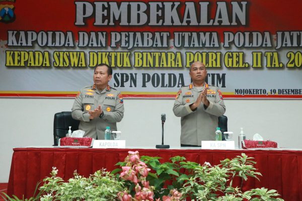 SURABAYA, Persindonesia.com, – Kapolda Jawa Timur Irjen Pol Toni Harmanto bersama Pejabat Utama Polda Jatim memberikan pembekalan kepada siswa Pendidikan Pembentukan (Diktuk) Bintara Polri gelombang II Tahun Anggaran 2022 di Sekolah Polisi Negara (SPN) Polda Jatim, Mojokerto. Senin (19/12/2022).