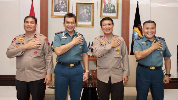 SURABAYA, Persindonesia.com,- Kapolda Jawa Timur Irjen Pol Nico Afinta, bersama Wakapolda Jatim Brigjen Pol Slamet Hadi Supraptoyo, didampingi Pejabat Utama Polda Jatim, Kamis (11/8/2022) siang, menerima dengan hangat kunjungan kehormatan Pangkoarmada II Laksda TNI Dr. T.S.N.B Hutabarat dan Danlantamal V Surabaya Laksma TNI Supardi di Lobby lantai 2 Gedung Patuh, Mapolda Jatim.