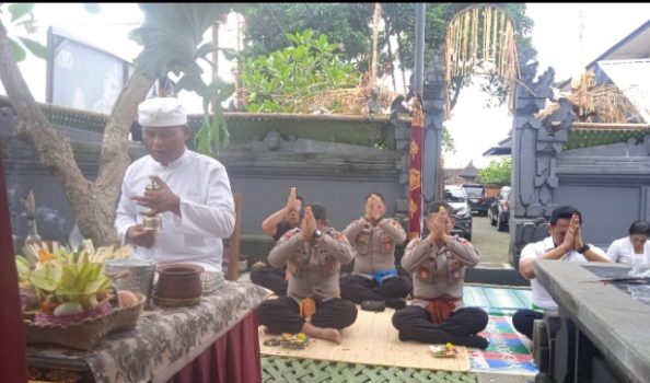 Kepala Kepolisian Resor Bangli AKBP I Gede Putra, SH., S.I.K., MH didampingi pejabat utama Polres Bangli menghadiri dan melaksanakan sembahyang bersama dalam rangka piodalan di Pura Padmasana Polsek Bangli, Rabu (22/1/2025).