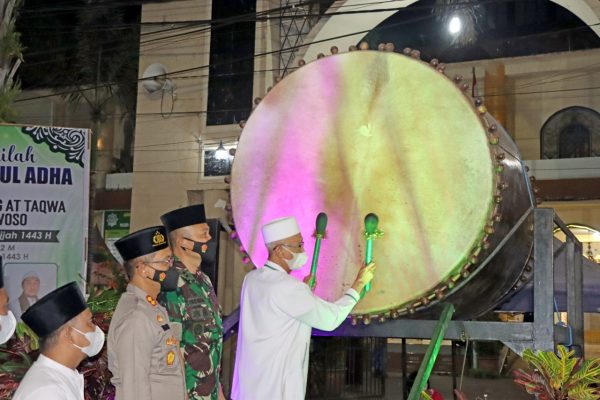 BONDOWOSO, Persindonesia – Untuk menyemarakkan dan menyambut Hari Raya Idul Adha 1444 Hijriyah, Kapolres Bondowoso AKBP. Wimboko SIK. bersama dengan jajaran Forkopimda Sabtu (9/7/2022) malam menggelar takbir bersama di Masjid Agung At Taqwa.
