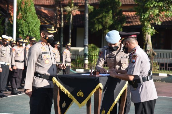 BONDOWOSO, Persindonesia – Kapolres Bondowoso AKBP. Wimboko S.I.K, Jumat (15/7/2022) pagi usai menggelar apel memimpin sertijab 5 perwira jajarannya di halaman Mapolres Bondowoso, ke 5 perwira yang melaksanakan sertijab diantaranya Kabag Ops Kompol Agustinus Roby Hartanto. S.H menempati pos barunya sebagai Kasubag Anev Bagbinopsnal Ditsamapta dan digantikan oleh AKP. Raden Heru Wahyudi SH, yang sebelumnya sebagai Kapolsek Kota Bondowoso.
