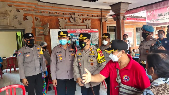 Dalam memastikan pelaksanaan Gerai vaksin sesuai target Kapolres Gianyar AKBP I Made Bayu Sutha Sartana, S.I.K., M.H. langsung meninjau pelaksanaan vaksinasi di Kantor Desa Tulikup.