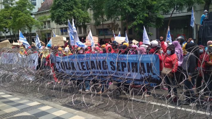 Surabaya, Persindonesia– Sejumlah Karyawan/Karyawati PT. HSI (Hana Star Indonesia) Sidoarjo yang tergabung dalam Serikat Pekerja Nasional (SPN), menggelar aksi unjuk rasa di kantor Permata Bank Jalan Tunjungan Surabaya. Selasa (4/1/2022) sekira pukul 10.00 wib.