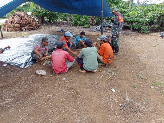 Sertu Salimin, anggota Satgas TMMD ke -120 melaksanakan kegiatan Komunikasi Sosial (Komsos) dengan warga yang turut membantu pekerjaan membangun Musholla yang menjadi sasaran fisik ,