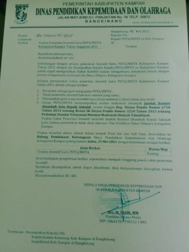 Pada hari ini Kamis tanggal 27 Mei 2021, Yamin mengungkapkan kepada Humas Kemenag Kampar Gustika Rahman SPdI, bahwasanya pada tanggal 25 Mei 2021, Pihak dari Dinas Dikpora mengeluarkan surat Nomor : 900/Dikpora-TP/4928, Perihal Usulan Penerima Insentif Guru PDTA/MDTA Kab. Kampar Tahun Anggaran 2021, yang ditujukan kepada setiap Kepala PDTA/MDTA Se-Kab. Kampar, untuk mendata lagi Guru-Guru MDTA. Kita di Kemenag hanya tembusan saja.