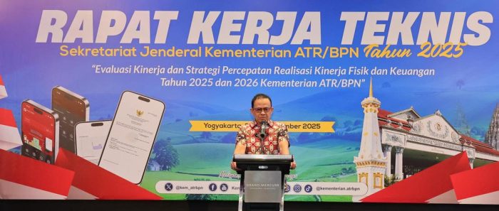 Hal tersebut disampaikan Direktur Jenderal Penetapan Hak dan Pendaftaran Tanah (PHPT) Kementerian ATR/BPN, Asnaedi, saat memberikan arahan dalam Rapat Kerja Teknis (Rakernis) Sekretariat Jenderal Kementerian ATR/BPN yang digelar di Yogyakarta, Senin (22/12/2025).