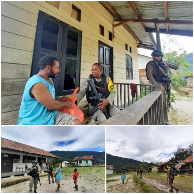 Persindonesia.com PAPUA, Satuan Tugas (Satgas) Damai Cartenz Satbrimob Polda Kaltim mengunjungi warga Kampung Okising, Distrik Oksibil, Pegunungan Bintang, Papua, Jumat (25/2/2022). Dalam kunjungan itu, para pasukan Brimob Polda Kaltim membawa bantuan sembako bahan makanan untuk warga setempat.
