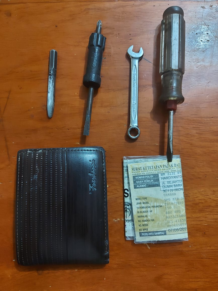Kemudian terhadap terduga pelaku curanmor ini dibawa ke Polsek Tapung untuk dilakukan proses hukum lebih lanjut, petugas juga mengamankan barang bukti berupa 1 unit sepeda motor Yamaha Vixion Warna Hitam BM-3131-RY, 2 buah obeng, sebuah kunci T, sebuah kunci pas dan sebuah dompet.