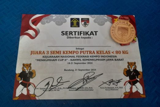 Klungkung,PersIndonesia.Com- Kesatria kempo Rumah Tahanan Negara (Rutan) IIB Klungkung, I Kadek Dwi Adnyana Putra berhasil meraih medali perunggu dalam kejuaraan Federasi Kempo Indonesia Menkumham Cup II pada hari Jumat (20/9/24).