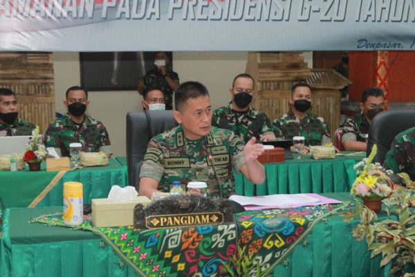 Pada even tingkat dunia yang dilaksanakan di Provinsi Bali tersebut, Pangdam IX/Udayana Mayjen TNI Sonny Aprianto, S.E., M.M., selaku Komandan Satuan Tugas Pengamanan Wilayah (Dansatgaspamwil) memimpin langsung Rakor kesiapan obyek pengamanan Presidensi G20.