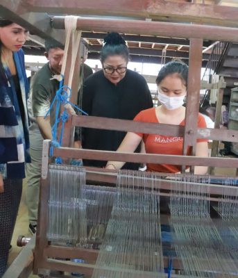 Mengawali kunjungannya pada pagi hari, Ny. Putri Koster beserta rombongan mengunjungi CV. Tarum Bali yang merupakan IKM yang bergerak dalam bidang pewarnaan kain menggunakan bahan organik dari daun tumbuh tumbuhan serta pembuatan kain tenun Tarum atau yang lebih dikenal di masyarakat dengan tenun kontemporer Bali. Dalam kesempatan tersebut, wanita yang akrab dipanggil Bunda Putri ini menyampaikan apresiasinya atas inovasi dari Tarum Bali khususnya dalam proses pewarnaan yang menggunakan bahan organik daun tumbuh tumbuhan, disamping warna warna yang dihasilkan sangat cantik juga limbah yang dihasilkan tidak berbahaya bagi lingkungan .