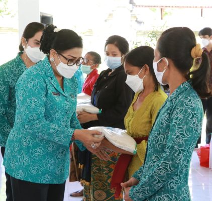 Jembrana – Ketua TP PKK Provinsi Bali Ny. Putri Suastini Koster didampingi Kepala Dinas Kehutanan dan Lingkungan Hidup Provinsi Bali I Made Teja dan Kepala Dinas Pemberdayaan Masyarakat Desa, Kependudukan dan Catatan Sipil Provinsi Bali Putu Anom Agustina melaksanakan kegiatan menyapa dan berbagi di wilayah Kabupaten Jembrana, Senin (23/5/2022).