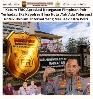 Ketua Umum Fast Respon Indonesia Center H.Dian Surahman melalui Sekjen H. Deden Hardening menyampaikan ” apresiasi terhadap Kepolisian Negara Republik Indonesia, yang menegaskan komitmennya dalam memberantas tindak pidana narkotika tanpa pandang bulu, termasuk terhadap oknum internal Polri.
