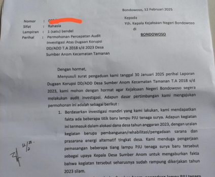 BONDOWOSO, PersIndonesia.com – Laporan dugaan korupsi dana desa tahun anggaran 2018 s/d 2023 desa Sumber Anom tidak berhenti sampai pelaporan saja. ILHAM, seperti diberitakan di edisi sebelumnya, masih aktif melakukan investigasi mandiri. Hasilnya, ditemukan beberapa fakta aneh. Salah satunya adalah pemasangan beberapa lampu PJU tenaga surya, yang sebelumnya tidak ada.