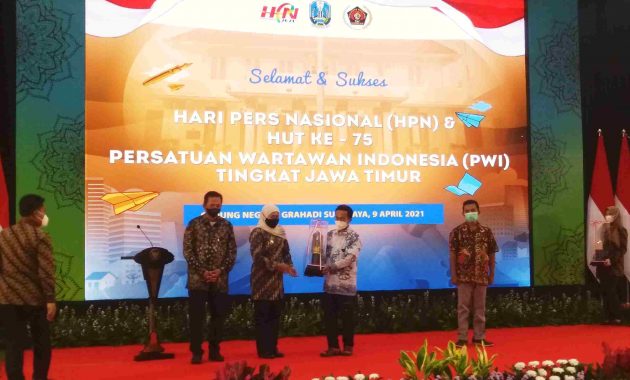 SURABAYA,Persindonesia,- Khofifah Indar Parawansa Gubernur Jatim hadir Dalam acara Peringatan Hari Pers Nasional (HPN) dan HUT Persatuan Wartawan Indonesia (PWI) Jatim ke 75 di Gedung Negara Grahadi Surabaya, Jum’at 9/4/2021.