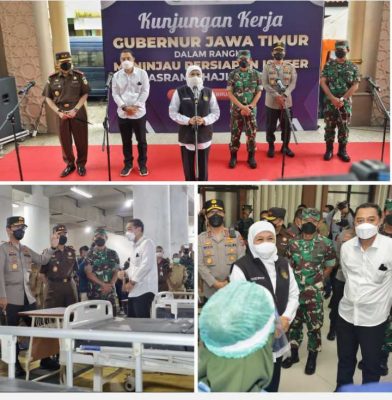 Hari ini, Senin (7/2/2022), Gubernur Jatim Khofifah Indar Parawansa, Pangdam V/Brawijaya Mayjend TNI Nurchahyanto, Kapolda Jatim Irjen Pol Nico Afinta, Pangkoarmada II Laksda TNI Iwan Isnurwanto, dan Kajati Jatim Mohamad Dofir, serta Walikota Surabaya Eri Cahyadi, melakukan pengecekan di tempat Isoter, untuk wilayah Surabaya Raya yang berada di Asrama Haji Sukolilo dan Rumah Sakit Darurat Lapangan Tembak Surabaya.