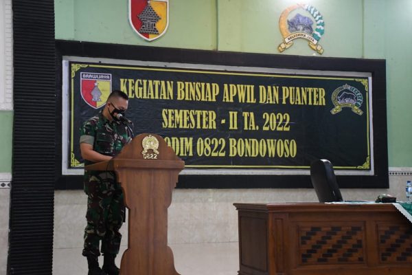 BONDOWOSO, Persindonesia – Dalam rangka meningkatkan kesiapan prajurit dalam pelaksanaan pembinaan dan pemberdayaan wilayah pertahanan di darat, Kodim 0822/Bondowoso mengelar kegiatan Pembinaan Kesiapan (Binsiap) Aparat Kewilayahan (Apwil) dan Kemampuan Teritorial (Puanter) Semester II TA. 2022.