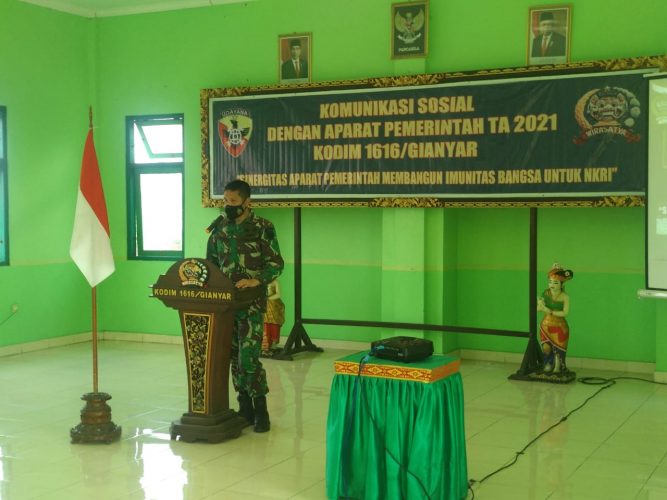 Dalam melaksanakan tugas pokok tersebut sangat membutuhkan dukungan dan peran serta dari segenap komponen bangsa melalui sistem pertahanan rakyat semesta yang disiapkan secara dini melalui pembinaan teritorial, untuk mewujudkan kebersamaan persepsi akan hal tersebut maka pada kesempatan yang berharga ini kami melaksanakan kegiatan komunikasi sosial dengan aparat pemerintahan dimana penyelenggaraan kegiatan komunikasi sosial dengan aparat pemerintah tahun 2021 adalah merupakan sarana untuk memelihara dan menjalin hubungan kerjasama yang harmonis antara aparat pemerintah di wilayah dengan Prajurit Kodim 1616 Gianyar dalam menghadapi berbagai permasalahan yang ada di wilayah terutama ancaman Pandemi COVID-19 serta dampak yang diakibatkannya secara terpadu melalui *sinergisitas aparat pemerintah membangun imunitas bangsa untuk NKRI*