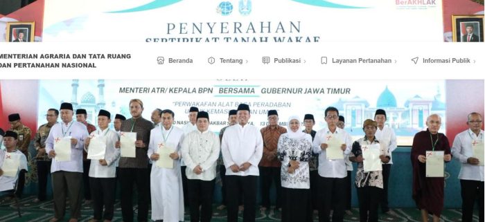 Sebagai bentuk penguatan kerja sama, Pemerintah Provinsi Jawa Timur dan Kantor Wilayah BPN Jawa Timur menandatangani nota kesepahaman (MoU) terkait percepatan sertipikasi tanah wakaf dan rumah ibadah. Kerja sama ini difokuskan pada validasi dan inventarisasi data agar proses sertipikasi berjalan efektif dan akuntabel.