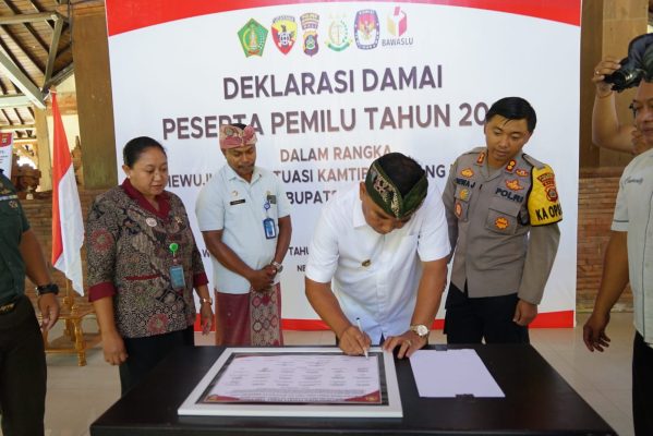 Persindonesia.com Jembrana – Mewujudkan Pemilihan Umum (Pemilu) yang aman damai dan kondusif di Tahun 2024, Bupati Jembrana I Nengah Tamba bersama unsur Forkopimda, KPU beserta 18 Partai Politik (Parpol) lakukan penandatanganan Deklarasi Damai Pemilu Tahun 2024 di Wantilan Pura Jagatnatha (7/9/2023).