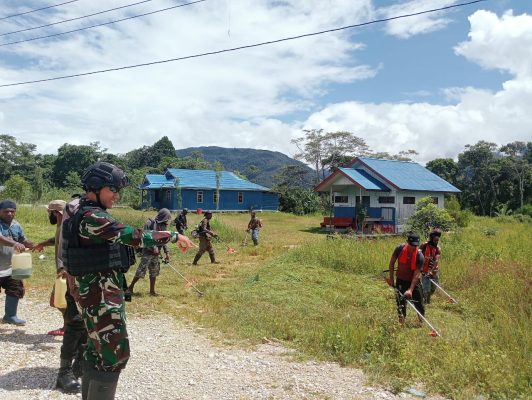 Persindonesia.com Mamberamo Tengah, Pos Kobagma Satgas Yonif Raider 200/BN dipimpin Lettu Inf Yanuar Resa bersama masyarakat melaksanakan kegiatan karya bakti membersihkan badan jalan di Kampung Gimbis Distrik Kobagma Kabupaten Mamberamo Tengah, Papua Pegunungan, Selasa (09/05/2023).