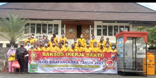 Surabaya, Persindonesia,- Dalam rangka memperingati HUT Bhayangkara ke 75 tahun, Polsek Lakarsantri melaksanakan giat Kerja Bakti di Masjid Baitur Rozaq Citraland Jum’at, 25/6/2021 pukul 07.30 wib.