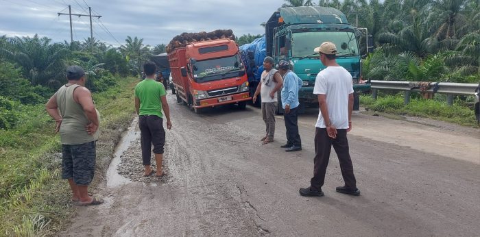 Pantauan awak media, jalan yang banyak lubang bak kolam ikan tersebut pada hari Kamis (13/07/2023) sekira pukul 16.30 Wib sore kemarin mengakibatkan 2 kendaraan tronton yang bermuatan pupuk dan kernel inti harus terduduk akibat rusak patah As Rumbung secara bersama dan berdekatan posisi rusaknya.