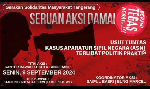 Adapun Gelar aksi damai yang akan digelar Senin, 9 September 2024. Didepan kantor Bawaslu Kota Tangerang, dalam hal ini Gerakan Solidaritas Masyarakat Tangerang tersebut meminta kepada Bawaslu Kota Tangerang mengusut tuntas dugaan keterlibatan Aparatur Negeri Sipil (ASN) dalam politik praktis.
