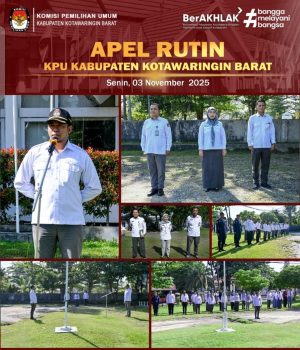 Pangkalan Bun, persindonesia.com – Komisi Pemilihan Umum (KPU) Kabupaten Kotawaringin Barat melaksanakan apel pagi di halaman kantor KPU yang berlokasi di Jalan Iskandar, Pangkalan Bun, Senin (03/11/2025).