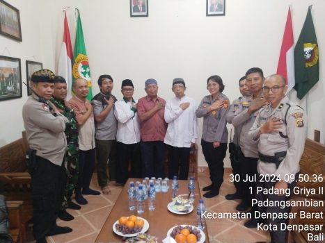 Denpasar – Kepala Kepolisian Sektor Denpasar Barat (Kapolsek Denbar), didampingi Kanit Binmas, Ps. Kanit Intelkam, Panit Bimas, Bhabin Kamtibmas dan Babinsa Kelurahan Padangsambian beserta anggota Intelkam Polsek Denbar melakukan kunjungan kerja dengan menyambangi Tokoh Agama di Sekretariat LDII Denpasar Jl. Padang Griya I No. 1, Lingkungan Padang Griya, Kelurahan Padangsambian, Kecamatan Denpasar Barat, Selasa (30/7/2024) pagi.