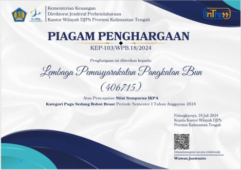 Pangkalan Bun – Persindonesia.com Lapas Kelas IIB Pangkalan Bun, Kantor Wilayah Kementrian Hukum dan HAM Kalimantan Tengah kembali menerima penghargaan dari kanwil DJPb Provinsi Kalimantan Tengah atas prestasi peraih capaian Indikator Kinerja Pelaksanaan Anggaran (IKPA) predikat Nilai sempurna periode Semester I Tahun 2024 dengan nilai 100 untuk Kode Satker (406715).