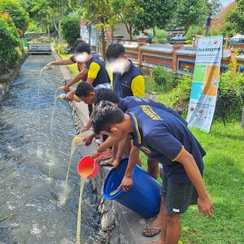 “Setelah 3 bulan fermentasi, hari ini Eco Enzyme dipanen dan langsung diaplikasikan dalam Aksi Jernihkan Sungai. Sekitar 50 liter Eco Enzyme dituangkan oleh anak binaan ke sungai yang ada di depan LPKA Kelas II Karangasem. Tidak hanya itu, 10 liter Eco Enzyme juga dituangkan ke kolam dan selokan di dalam lingkungan LPKA”, jelasnya.