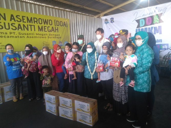 Direktur PT. Susanti Megah juga memberikan bingkisan khusus buat anak anak stunting yang ada di wilayah Kecamatan Asemrowo, ketika ditemui awak media Rini Ketua TP PKK Kota Surabaya menjelaskan, Acara semacam ini sangat diperlukan oleh warga Surabaya, apalagi ditengah kondisi pandemi seperti sekarang ini, Rini sangat mengapresiasi PT. Susanti Megah yang mau berperan serta membantu masyarakat dengan menciptakan UMKM di daerah Asemrowo yang mana warga yang tergabung dalam UMKM tersebut bisa berjualan di dalam area Pabrik PT. Susanti Megah untuk melayani makan dan minum karyawan PT. Susanti Megah yang berjumlah sekitar 700 orang tersebut”, ungkap Rini.