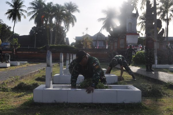 “Kita pilih Taman Makam Pahlawan untuk mewujudkan kecintaan prajurit TNI kepada pejuang yang telah mendahului kita, sesuai sejarahnya maka kegiatan kali ini memfokuskan pada kegiatan pembersihan TMP Kesatria Kusuma Mandala dengan melibatkan personil Kodim 1617/Jembrana, Batalyon Infanteri 741/Garuda Nusantara,” ungkap Pasiter Kapten Inf Tri Winarto