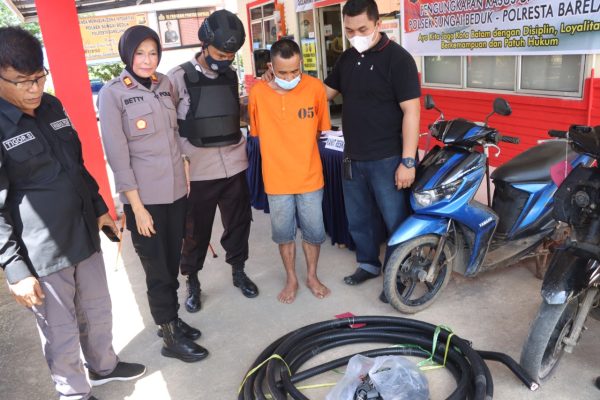 Awalnya, lanjut Betty, pada hari Selasa 24 Mei 2022 sekira pukul 03.00 wib, pihaknya mendapat informasi dari warga adanya pencurian kabel di tower, sehingga Unit Opsnal Reskrim langsung menuju lokasi dan mengamankan 1 pelaku yang sudah ditangkap warga. “Pelaku diketahui warga saat mereka memanjat tiang tower dan berisik diatas, sehingga warga curiga dan memergoki mereka sedang curi kabel,” ucapnya didampingi oleh Kasi Humas AKP Tigor Sidabariba dan Kanit Reskrim Ipda Yogi Ditia Permana.