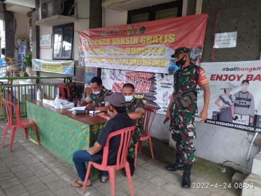 Persindonesia.com Jembrana – Tim Vaksinator Mobile Kodim 1617/Jembrana bersinergi dengan Tim Vaksinator dari Puskesmas II Jembrana kembali menggelar serbuan vaksinasi Covid-19. Serbuan vaksinasi yang berlangsung di Puskesmas II Jembrana kali ini merupakan tahap ketiga (Booster) yang ditujukan kepada masyarakat umum dan lansia, Minggu (24/04/2022)
