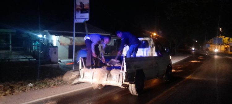 Sekira pukul 23.00 WIB,Senin 24/01/2022 pantaun awak media saat berada di lokasi tumpahan minyak CPO tampak dari petugas Satlantas Polres Pangkalpinang di bantu warga sekitar RT/RW 02/03 Kelurahan Ketapang Kecamatan Pangkalbalam bahu membahu menaburkan pasir agar tumpahan CPO menjadi meresap untuk mengurangi licinnya bahu jalan.