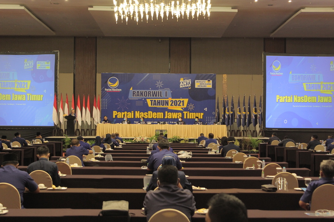 Surabaya, PersIndonesia – Setelah menjalani beberapa kunjungan kerja ke beberapa daerah, hari Sabtu 9 Januari 2021, Bertempat di Ballroom Dyandra Surabaya, DPW NasDem Jatim mengadakan Rapat Koordinasi Wilayah (RAKORWIL) yang di hadiri sekitar 200 an peserta utusan dari seluruh Jawa Timur.