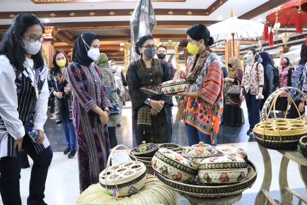 Denpasar (Persindo) – Setelah sehari sebelumnya dikunjungi rombongan delegasi Inter-Parliamentary Union (IPU) Assembly & Related Meetings, Rabu (23/3/2022), Pemeran IKM Bangkit di Taman Budaya Provinsi Bali mendapat kunjungan dari rombongan Dharma Pertiwi Pusat. Rombongan dipimpin langsung oleh Istri Panglima TNI selaku Ketua Umum Dharma Pertiwi Ny. Hetty Andika Perkasa. Kedatangan istri Panglima TNI disambut langsung oleh Ketua Dewan Kerajinan Nasional Daerah (Dekranasda) Provinsi Bali Ny. Putri Koster dengan penyerahan buket bunga.