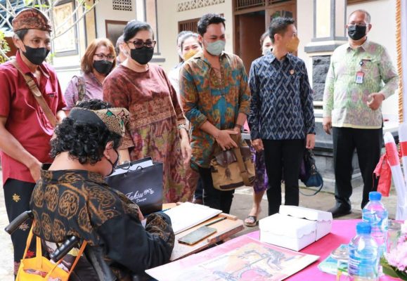 Denpasar  (Persindo) – Selepas membuka acara Pemeran Bali Bangkit Tahap II di Taman Budaya-Artcenter, Ny. Putri Koster bersama anggota Dekranasda Provinsi Bali, Kepala Taman Budaya-Denpasar, dan Designer Taksu, mengunjungi mini Galery Lukisan Agus Mertayasa yang merupakan pelukis difabel yang memiliki talenta luar biasa. Bertempat dikediaman Agus Mertayasa, Desa Buduk, Kabupaten Badung pada (23/2).