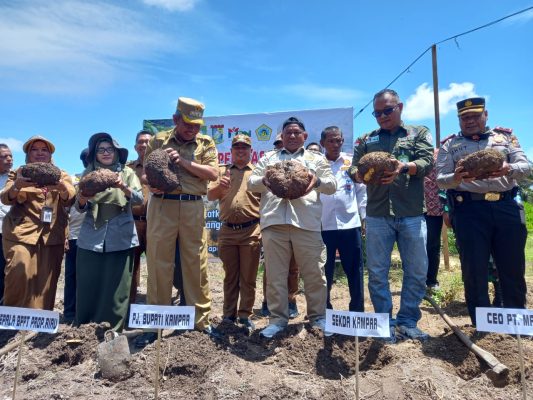 Tapung – Pj Bupati Kampar Dr. H. Kamsol MM bersama Ketua KTNA Provinsi Riau Drs. H. Yusri, M.Si melakukan Perdana Perdana sebanyak 30 Ton Umbi Porang sekaligus pelepasan perdana umbi porang komoditas pangan riau unggul ke PT. Mitra Porang Nusantara (MPN) di Desa Kijang Rejo Kecamatan Tapung, Senin 22-08-2022.