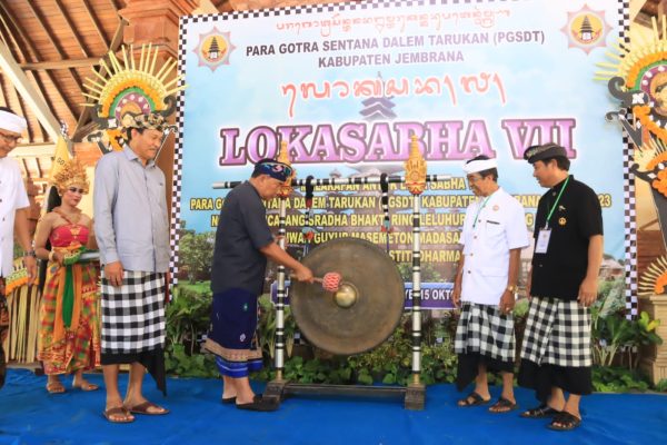 Persindonesia.com Jembrana – Bupati Jembrana menghadiri membuka Lokasabha VII Para Gotra Sentana Dalem Tarukan (PGSDT) Kabupaten Jembrana Tahun 2023 yang ditandai dengan pemukulan gong di Wantilan Pura Jagatnata Jembrana, Minggu (15/10).