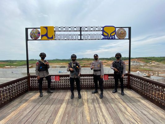 Personil Batalyon C Pelopor Satbrimob Polda Kaltim yang tergabung Satgas Ops Nusantara Polda Kaltim melaksanakan patroli ke obyek titik IKN salah satunya bendungan sepaku semoi yang masuk ke wilayah IKN Kec Sepaku. kab. Penajam Paser Utara.