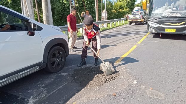 Persindonesia.com Jembrana – Banyak merenggut nyawa korban lantaran jalan berlubang menjelang akhir tahun, Polsek Pekutatan berinsiatif menutup jalan belubang di jalan utama Denpasar-Gilimanuk yang merupakan jalur nasional, tepatnya di Banjar Pesinggahan, Desa Medewi, Kecamatan Pekutatan, Km 73.