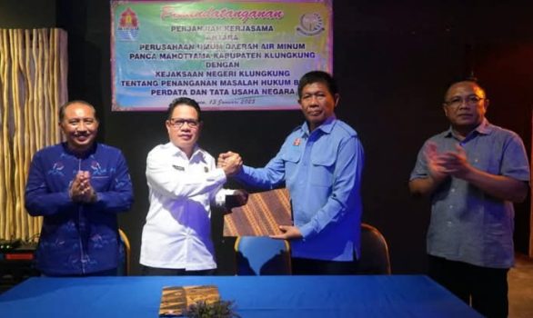 Penandatanganan kerjasama, pada hari Minggu (12/1/25) dilakukan antara Dirut PDAM Panca Mahotama, I Nyoman Renin Suyasa dan Kepala Kejari (Kajari) Klungkung, Lapatawe B Hamka serta disaksikan oleh Pj Bupati Klungkung, I Nyoman Jendrika bersama Sekda Anak Agung Gde Lesmana.