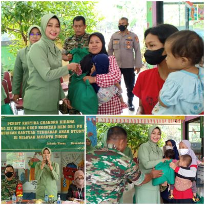 Kepedulian Persit Kartika Chandra Kirana Cabang XIX Kodim 0505 Koorcab Rem 051 PD Jaya kepada Anak Stunting yang diberikan bantuan di wilayah Koramil 01/Jatinegara s.d Koramil 08/Duren Sawit jajaran Kodim 0505/JT, seperti untuk hari ini di Koramil 06/Cakung, dengan menghadirkan Keluarga dari anak stunting oleh Danramil Cakung, kita berikan sedikit bantuan bingkisan sembako sebagai bentuk kepedulian Persit Kartika Chandra Kirana Cabang XIX Kodim 0505, serta keberadaan kami ada dalam kesulitan rakyat walaupun tidak seberapa nilainya, disamping itu juga kita berikan motivasi kita sampaikan ke ibu-ibunya kita sama-sama menanggulangi permasalahan stunting sampai dengan tuntas diwilayah Jakarta timur.