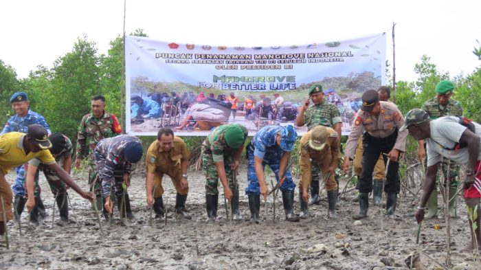 Persindonesia.com Timika — Guna mencegah abrasi serta lestarikan alam kawasan pesisir pantai, Kodim 1710/Mimika bersama satuan TNI-Polri dan Pemda Mimika melaksanakan penanaman Mangrove bertempat di Pelabuhan Kp. Pomako, Distrik Mimika Timur, Kab. Mimika, Senin (15/05/2023).