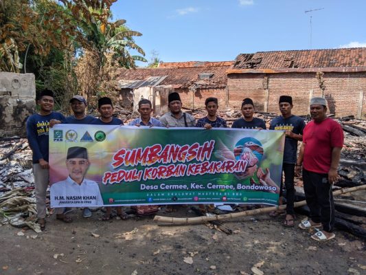 BONDOWOSO, Persindonesia.com – Mendengar adanya kebakaran rumah di Desa Cermee, Kecamatan Cermee, Bondowoso. H.M. Nasim Khan Anggota DPR RI F-PKB intruksikan Tim Nasim Khan Indonesia (NKI) turun langsung ke lokasi untuk memberikan sumbangsih pada korban kebakaran.
