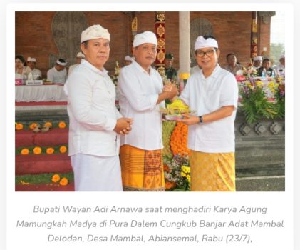 ABIANSEMAL persindonesia.com – Pemerintah Kabupaten Badung kembali menunjukkan komitmennya dalam mendukung pelestarian adat dan budaya lokal. Hal ini terlihat dari kehadiran langsung Bupati Badung I Wayan Adi Arnawa bersama Nyonya Rasniathi Adi Arnawa dalam upacara Karya Agung Mamungkah Madya di Pura Dalem Cungkub, Banjar Adat Mambal Delodan, Desa Mambal, Kecamatan Abiansemal, Rabu (23/7).